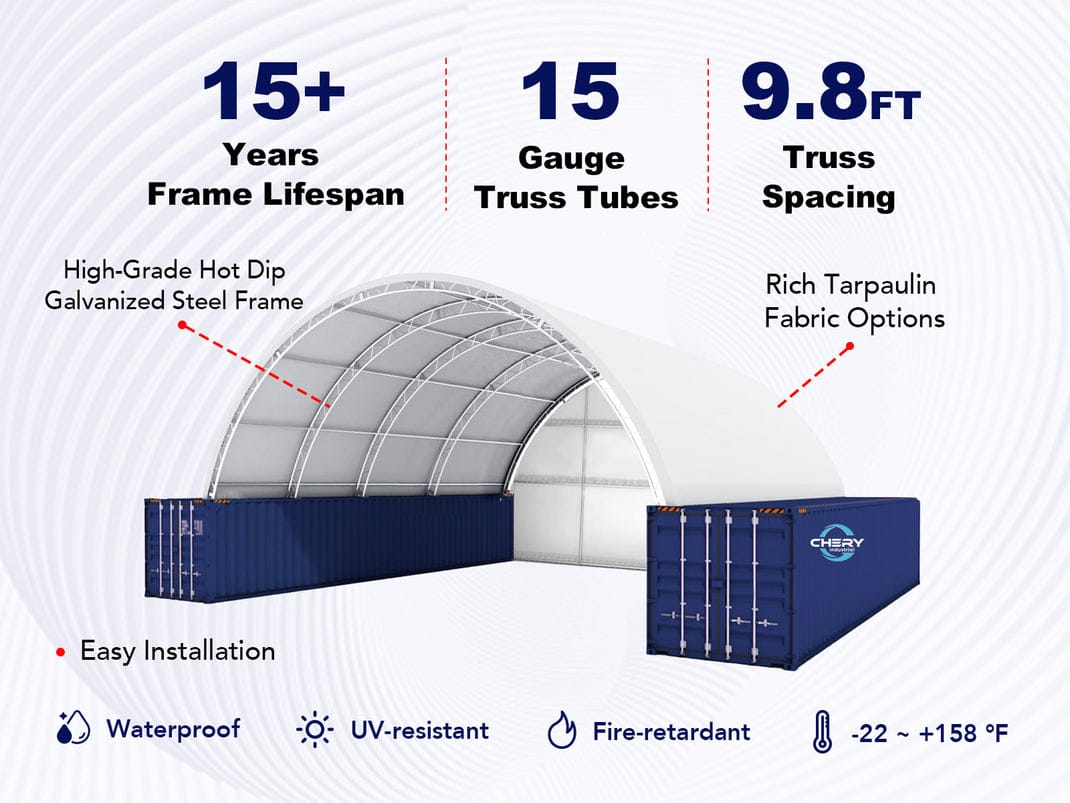 Compared with generic tarp carports from big‑box stores, Chery’s container shelters use noticeably heavier frames and fabrics—15 oz and 22 oz PVC versus the thin PE that is common in budget models—which translates into better wind and storm behavior and a longer service life. Unlike freestanding hoop barns that require ground anchors or concrete, the container‑mounted design leverages the mass of your shipping containers for stability and avoids the need for a permanent foundation.